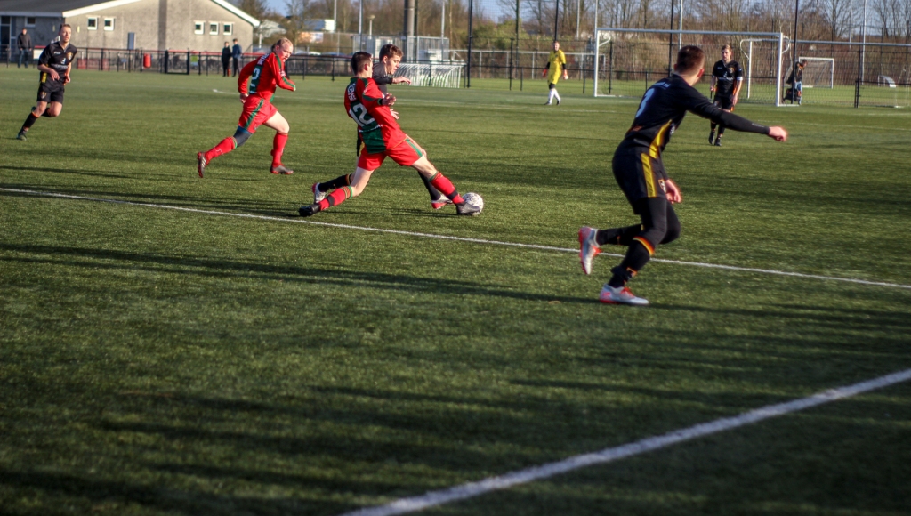 Want in de eerste helft hield de door blessures geplaagde formatie van trainersduo Kleefstra en Spek de gelederen achterin goed gesloten. De in vorm zijnde thuisploeg (12 uit 4) kwam ondanks een groot overwicht in de eerste helft niet verder dan een gevaarlijke kopbal, net over. En éénmaal veranderde een windvlaag een simpele vangbal voor doelman Gerrit Daleman plots in een gevaarlijke situatie, welke de doelman nog onschadelijk kon maken. Aan de andere kant werd de doorgebroken Lars Rozema nog net op reglementaire wijze afgestopt en zag Marco van Leijen de vermaledijde wind zijn voorzet tot gevaarlijke doelpoging promoveren.